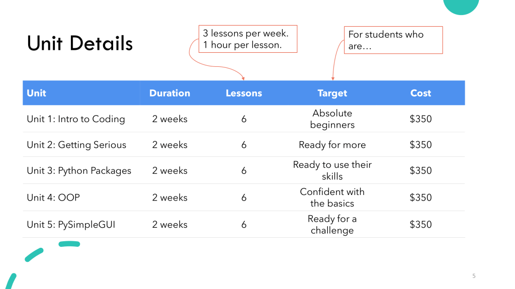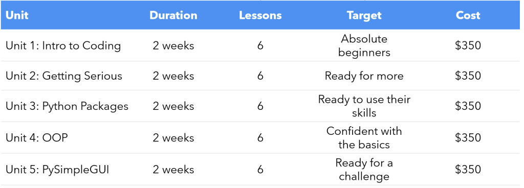 All units have the same duration (2 weeks), number of lessons (6 x 1hr lessons), and cost.