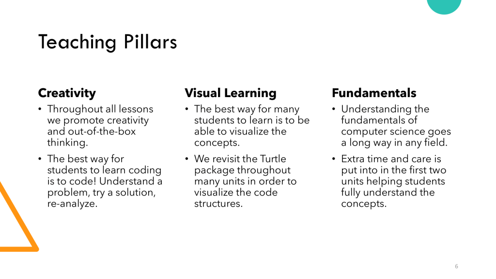 - Unit 1: Intro to Coding: Use the Turtle package to learn about commands, functions, operators, and loops. Emphasis on fundamentals. Major projects include creating digital art!